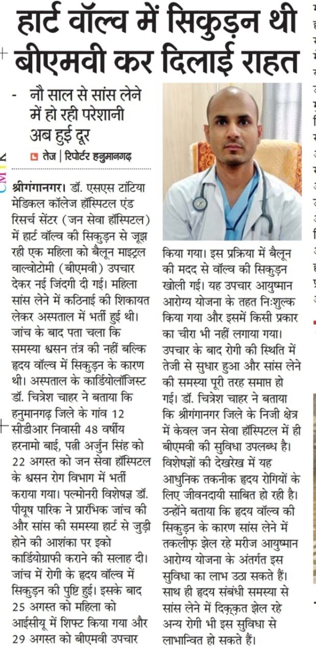 A woman suffering from Shrinkage of a heart valve was successfully treated with Balloon Mitral Valvotomy (BMV) at Jan Sewa Hospital, part of Dr. S.S. Tantia Medical College, Hospital and Research Centre, Sri Ganganagar.