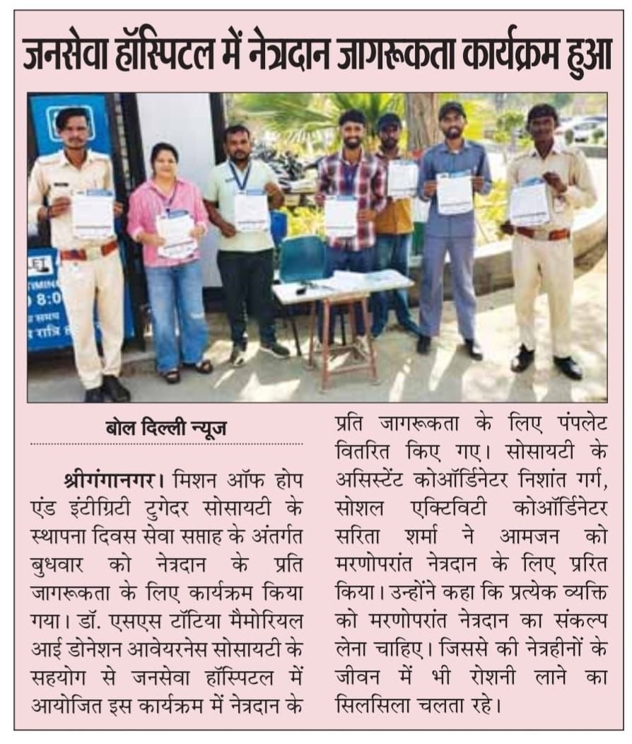 As part of the 'Sewa Saptah' (Service Week) marking the Foundation Day of the 'Mission of Hope and Integrity Together Society,' an awareness program regarding eye donation was organized on Wednesday. Held at Jan Sewa Hospital in collaboration with the Dr. S.S. Tantia Memorial Eye Donation Awareness Society, the event featured the distribution of pamphlets aimed at raising awareness about eye donation. The Society's Assistant Coordinator, Nishant Garg, and Social Activity Coordinator, Sarita Sharma, encouraged members of the general public to pledge their eyes for donation after death. They emphasized that every individual should resolve to donate their eyes posthumously, thereby ensuring that the endeavour to bring light into the lives of the visually impaired continues uninterrupted.
