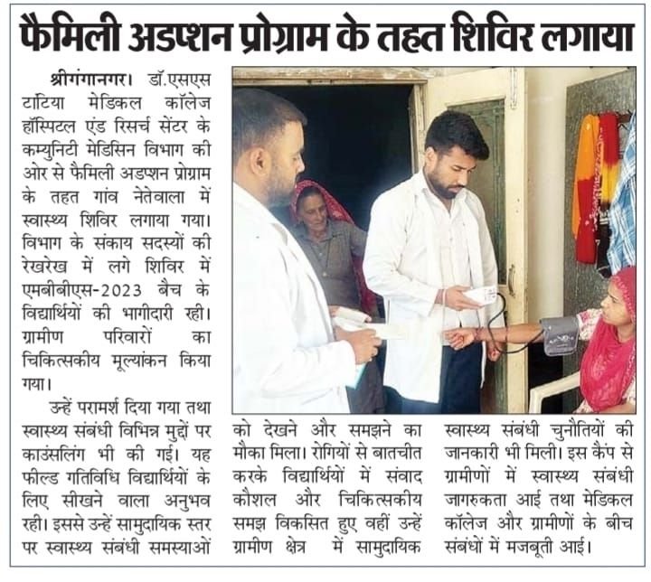 A health camp was organized in Netewala village, Sri Ganganagar, under the Family Adoption Program by the Department of Community Medicine of Dr. S.S. Tantia Medical College, Hospital and Research Center. Faculty members supervised the camp, and MBBS 2023 batch students actively participated. During the camp, rural families were medically examined, given advice, and counselled on various health issues. The activity provided a valuable learning experience for students, helping them understand community-level health problems and improve their communication and clinical skills. The camp also raised health awareness among villagers and strengthened the relationship between the medical college and the local community.