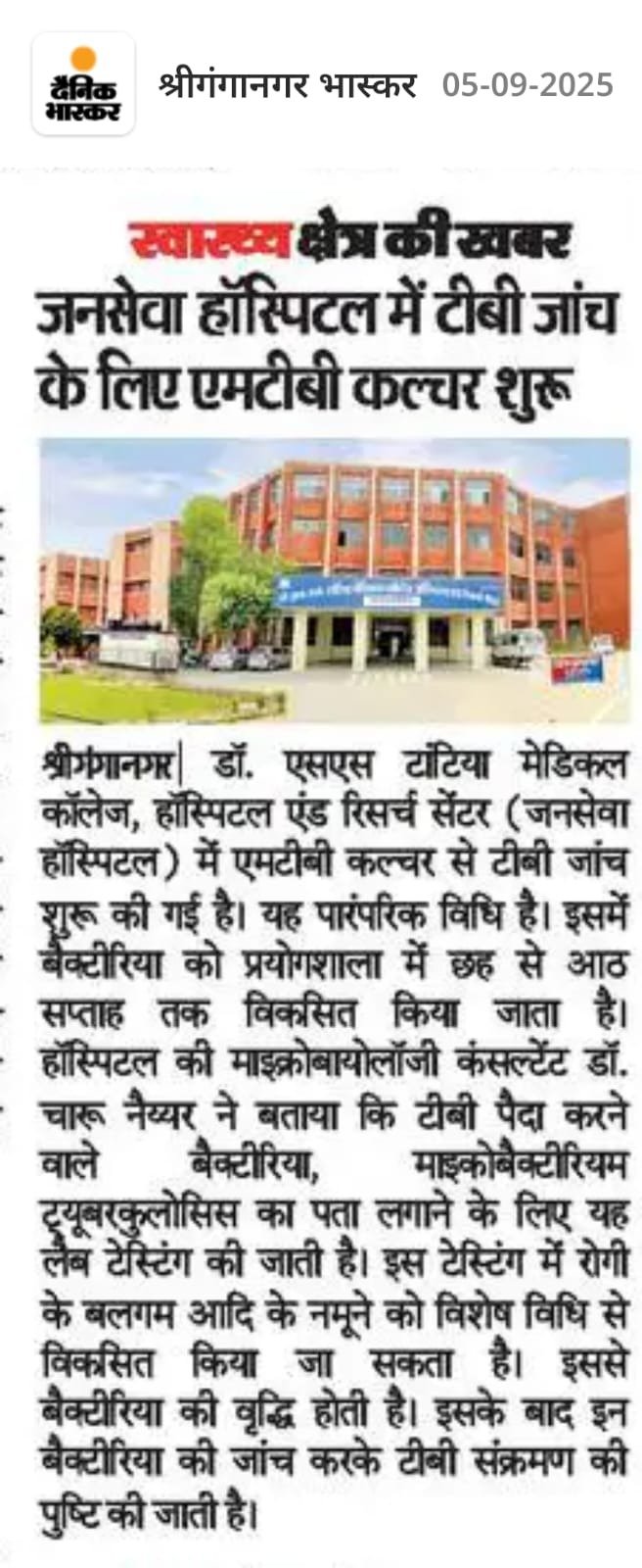 TB testing through MTB culture has been started at Dr. S.S. TANTIA MEDICAL COLLEGE, HOSPITAL AND RESEARCH CENTRE (Jana Sewa Hospital). This is the traditional method. In this, the bacteria are grown in the laboratory for six to eight weeks. Dr. Charu Nayyar, Microbiology consultant at the hospital, said the lab test is done to detect Mycobacterium tuberculosis, the bacteria that causes TB. In this testing, the patient's sputum sample etc. can be developed using a special method. This leads to the growth of bacteria. After this, TB infection is confirmed by examining these bacteria.