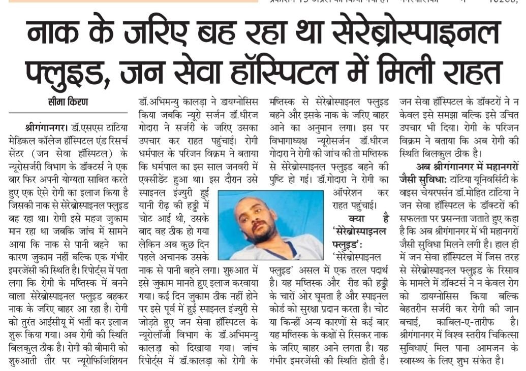 The issue was first identified by neurophysician Dr. Abhimanyu Kalra, who suspected the leak after examining reports. Neurosurgeon Dr. Dheeraj Godara, Head of the Neurosurgery Department, confirmed the diagnosis and performed surgery to stop the leak. The patient was admitted to the ICU and is now fully recovered.