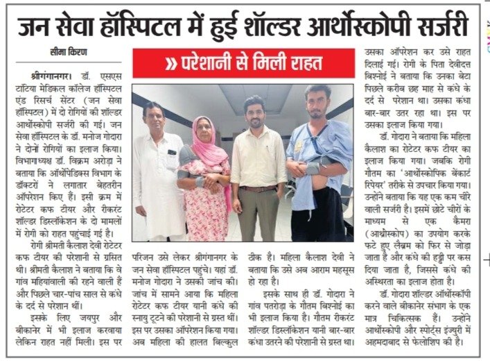 Two shoulder arthroscopy surgeries were successfully performed at Jan Sewa Hospital, part of Dr. S.S. Tantia Medical College, Hospital & Research Centre in Sri Ganganagar. The surgeries were conducted by Dr. Manoj Godara.