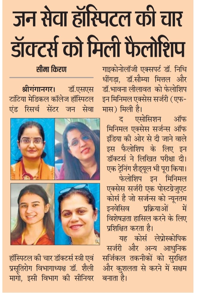 Four doctors from Dr. S.S. Tantia Medical College Hospital and Research Center, Jan SEWA Hospital: Dr. Shaili Mago, Head of the Department of Gynecology and Obstetrics, Dr. Nidhi Dhingra, Senior Gynecology Expert, Dr. Soumya Mittal, and Dr. Bhavana Lilawat, have received the Fellowship in Minimal Access Surgery (F-MAS).