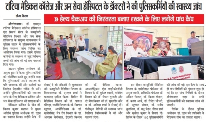 Dr. S.S. Tantia Medical College, Hospital and Research Center (Jan Sewa Hospital) organized a health checkup camp for police personnel at the police line, Sri Ganganagar. The camp, inaugurated by Superintendent of Police Dr. Amrita Duhan, aimed to promote health awareness among officers. A team of specialist doctors from various departments including medicine, surgery, orthopaedics, ENT, gynaecology, psychiatry, ophthalmology, and dentistry provided checkups and consultations. A total of 102 police personnel were examined. This camp marks the beginning of a series of five such camps to ensure the health checkup of all police personnel in the city.